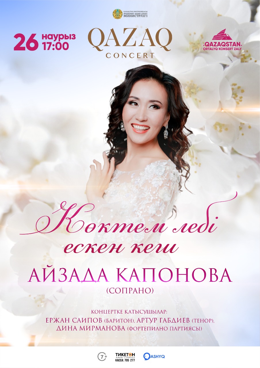 Приглашаем ценителей искусства на концерт прекрасной музыки «Көктемнің лебі ескен кеш»! Концерт представит известная оперная певица, кавалер ордена «Құрмет» Айзада Капонова (сопрано).